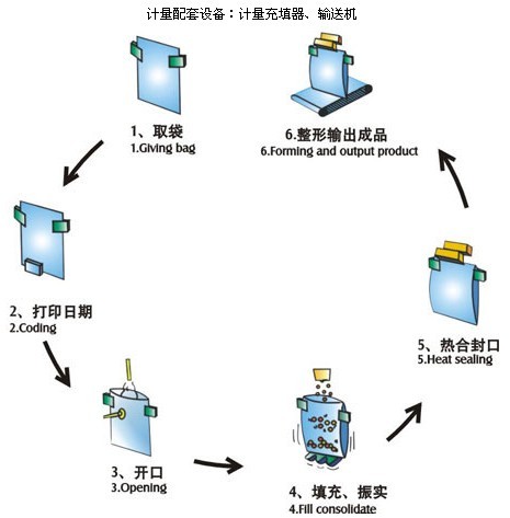 技術參數: 包裝材料:自立袋、手提袋、拉鏈袋、四邊封袋、三邊封袋、紙袋等復合袋 包裝袋尺寸:W:100-200mm L:100-300mm 充填范圍:5-1500g 包裝,:25-45包/分 (其,由產品自身及充填重量決定) 總功:1.5kw 外形尺寸:1540×1240×1465mm